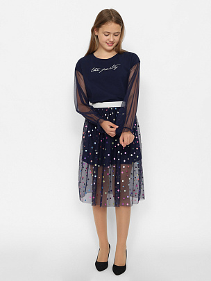 Нарядная двухслойная юбка для девочки из сетки с блестящими кружочками "конфетти". Эластичный пояс с люрексом. Подкладка выполнена из хлопкового трикотажа. Подкладка короче верхнего слоя сетки.