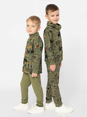 Толстовка с высоким воротником из основного полотна, карманом "кенгуру" и притачным поясом. Воротник спереди со вставкой из полотна с эластаном. Рукава длинные, с манжетами. Манжеты и пояс выполнены из полотна с эластаном.